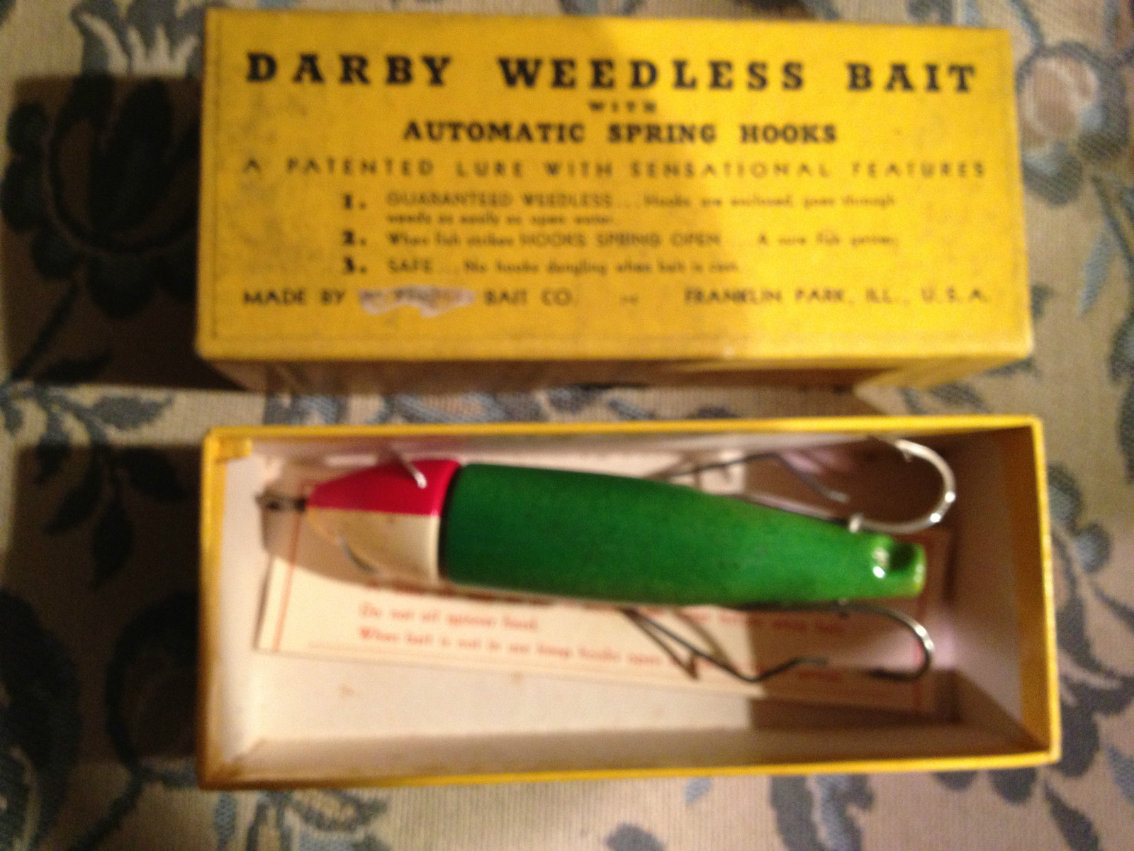 As to the second bait in the ad, it is an accurate picture of what is usually referred to as a “Decker Underwater Minnow”. When I first noticed this, I asked several knowledgeable collectors if they had ever seen this bait with the name “DECKER” on the spinners or on the body. No one said they had. One long-time collector told me that it had been assumed early in the hobby that this was a Decker as it was found laying in an open Decker box when folks went through the estate of a deceased NFLCC member. After this assumption was published in an early edition of Carl Luckey's Early Fishing Lures and Their Makers it seems to have been taken as gospel. Like the Floating bait, it has its hooks hung by split rings on staples. I do not know of a box that has this bait shown on the label.