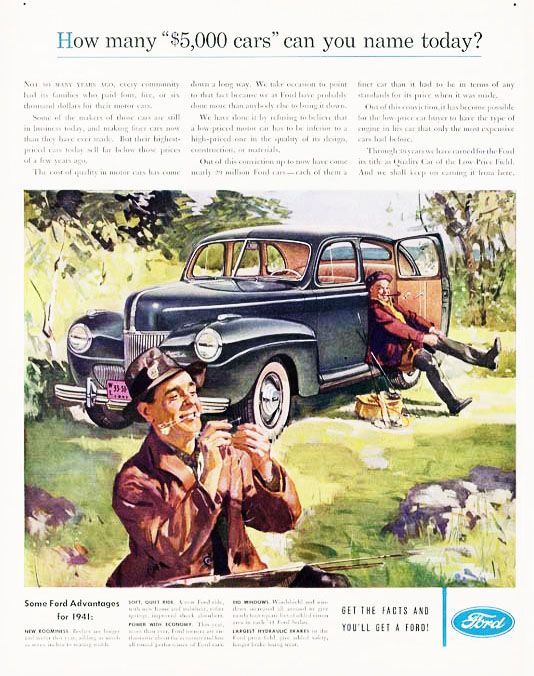 This week in The Fishing Advertisement we feature a great full page ad from 1941 from Ford. It asks "How many $5000 cars can you name?" Today, that is $79,100! That's an expensive car. This ad features a truly nice painting of a pair of gentleman preparing for a fishing trip in their new Ford touring car. At nearly $80,000 they should have been able to afford the best tackle available!